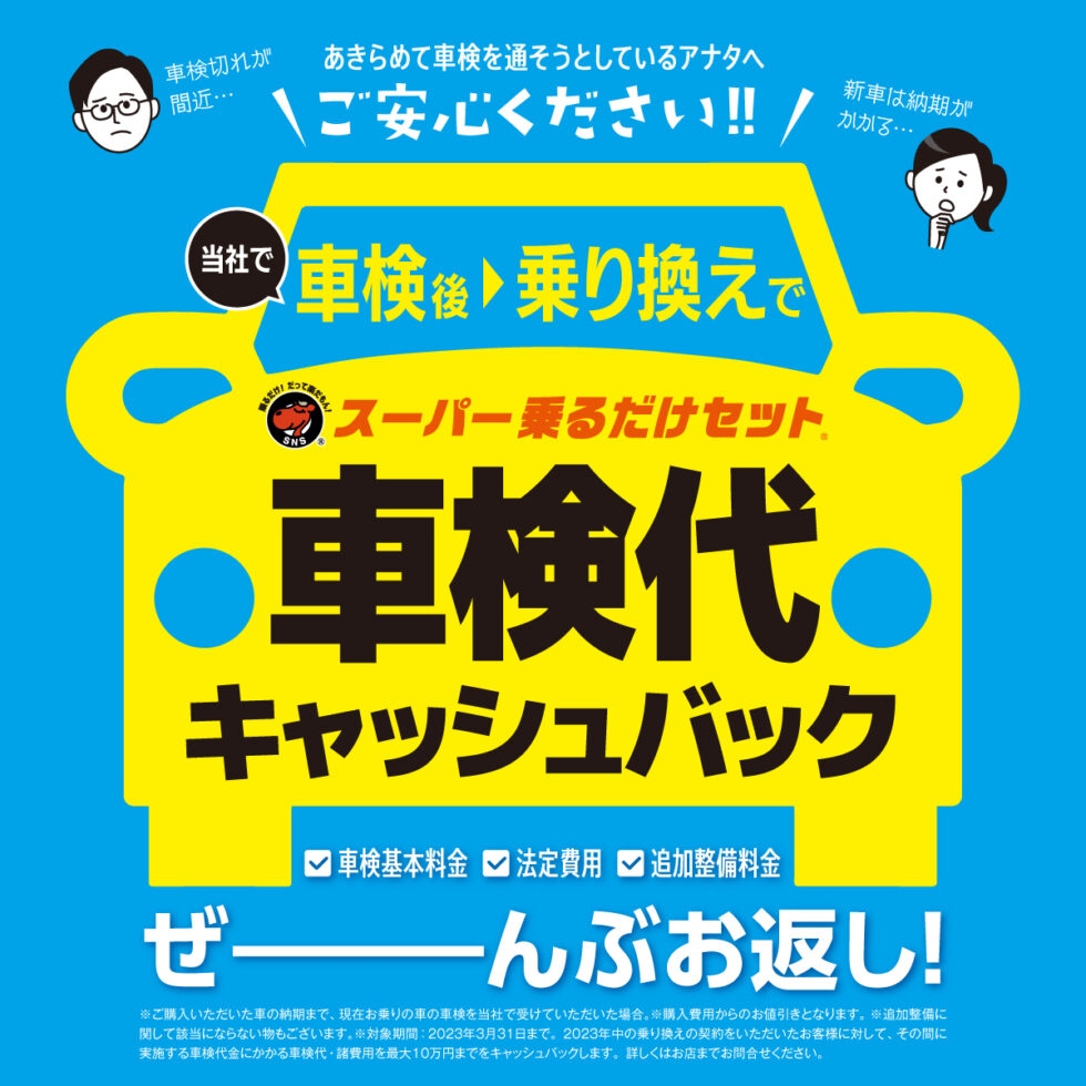 スーパー乗るだけセット富山会では、この状況下のなかで、お客様により安心・安全なカーライフをお届けするために、車検代金キャッシュバックキャンペーンを開始します。